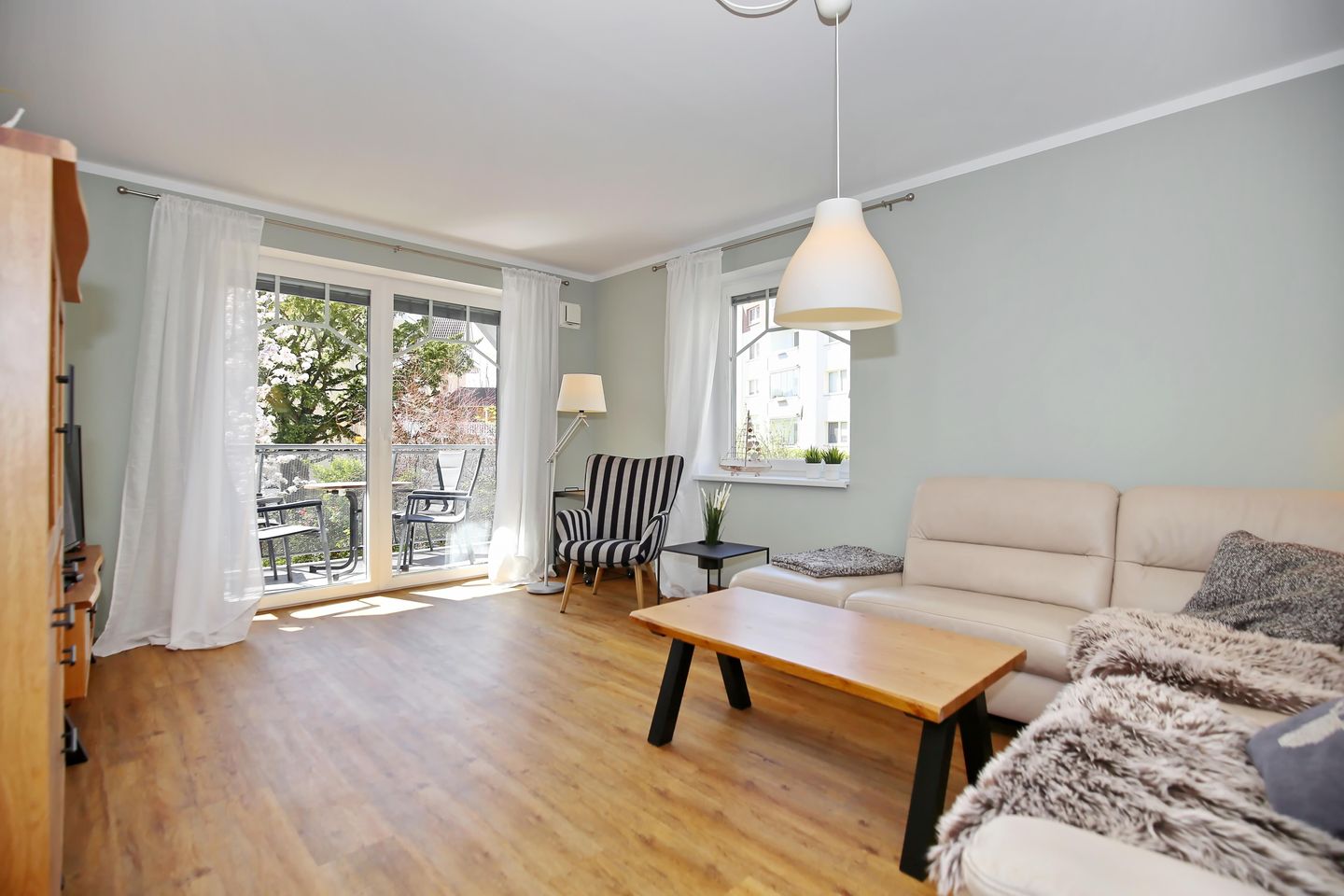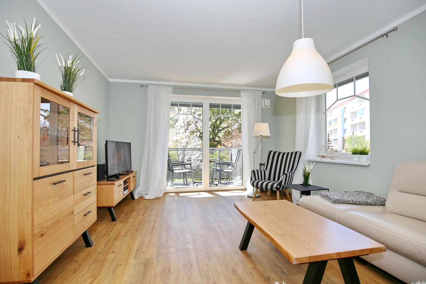 Im Wohnzimmer befindet sich eine bequeme Couch sowie ein Sessel. Selbstverständlich gehören auch ein Flachbild-TV, ein Radio mit CD-Player sowie ein WLAN-Anschluss zur Ausstattung. Die Couch lässt sich mit einigen Handgriffen in einen Schlafplatz verwandeln. Vom Wohnzimmer aus gelangst du auf den nach Süd-West ausgerichteten Balkon. Genieße hier die Abendsonne mit einem Glas Wein.