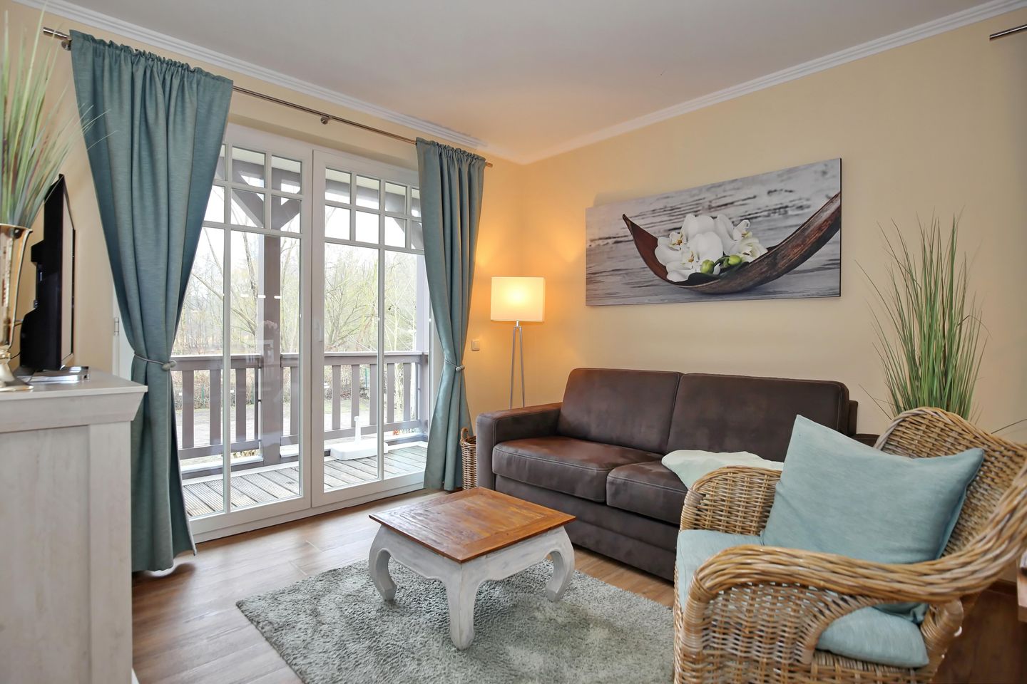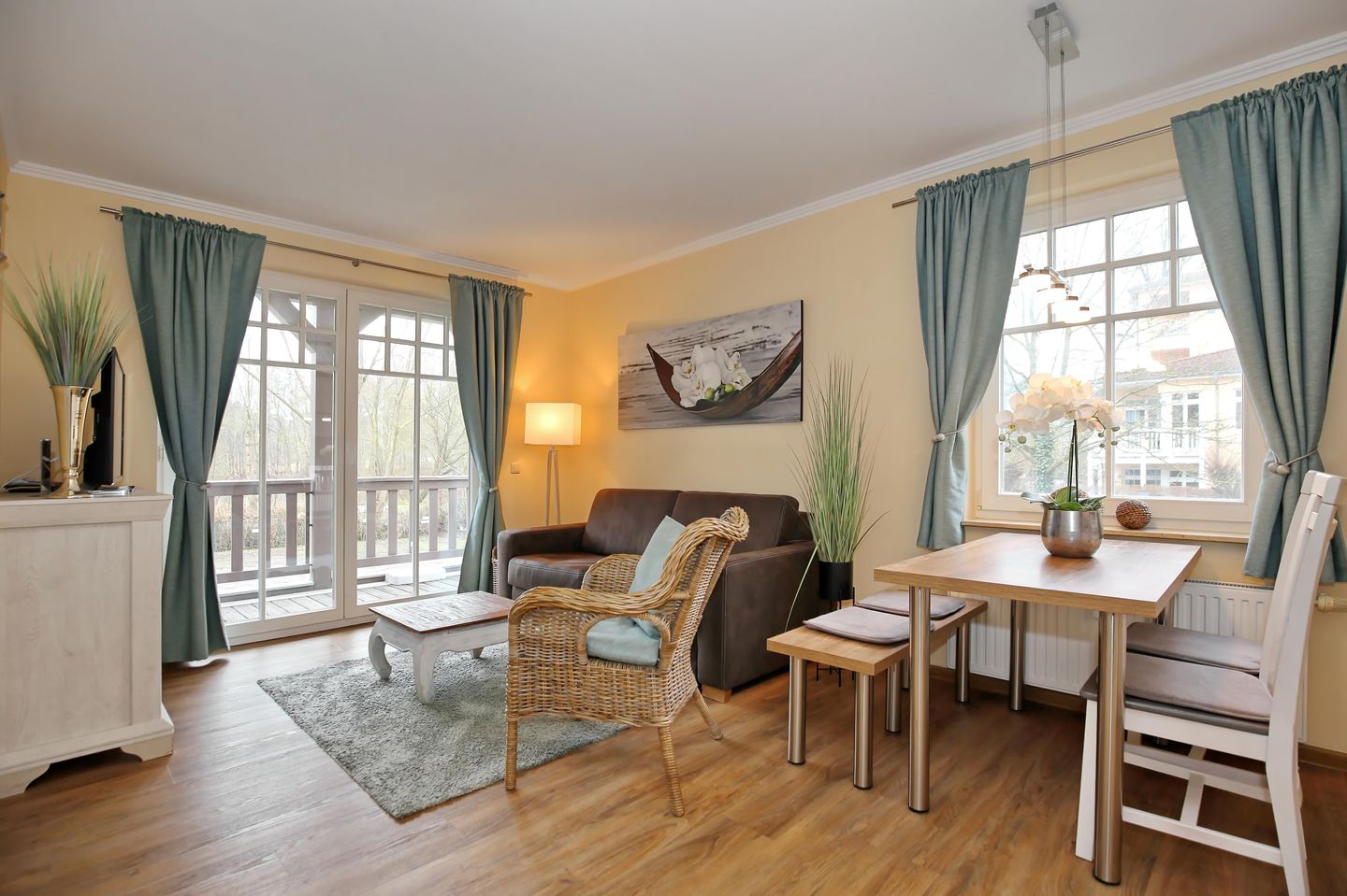 Im Wohnbereich erwarten dich eine ausziehbare Couch mit Schlaffunktion ein Couchtisch, ein Sideboard mit großem Flachbild-TV und ein Korbsessel. Der Essbereich lädt zu Mahlzeiten und Spieleabenden ein.
