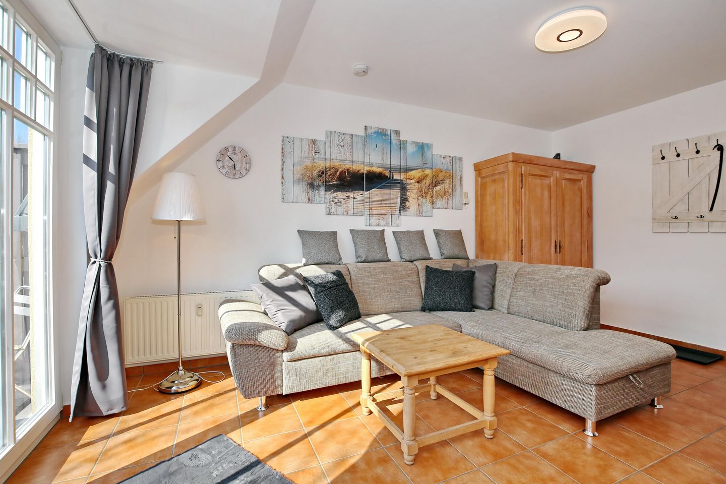 Der Wohnbereich der Ferienwohnung ist mit einem Sofa und zwei Korbsesseln gemütlich eingerichtet. Für deine Unterhaltung steht ein Flachbild-TV bereit. Außerdem verfügt die Wohnung über einen kostenlosen WLAN-Anschluss.