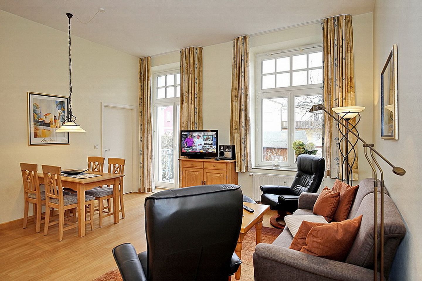 Zur Ausstattung im Wohnbereich gehören selbstverständlich ein Flachbild-TV, ein DVD-Player, ein WLAN-Anschluss und ein Radio mit CD-Player. Nimm auf dem gemütlichen Sofa oder den Schwing-Sesseln Platz und genieße entspannte Stunden in der Ferienwohnung. Gegenüber dem Sofa steht der Esstisch mit 4 Stühlen.