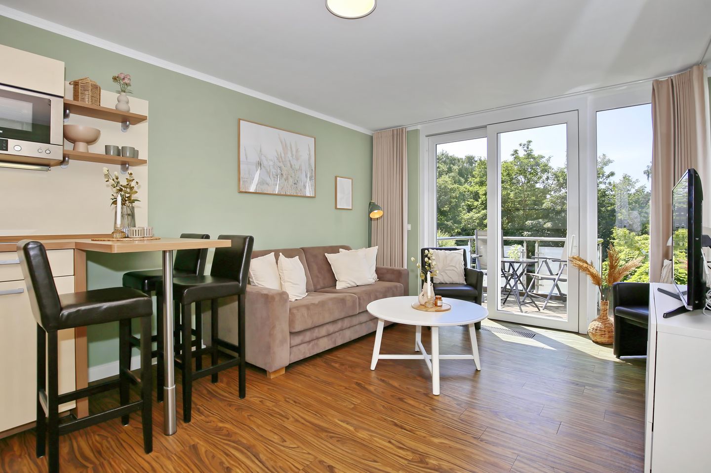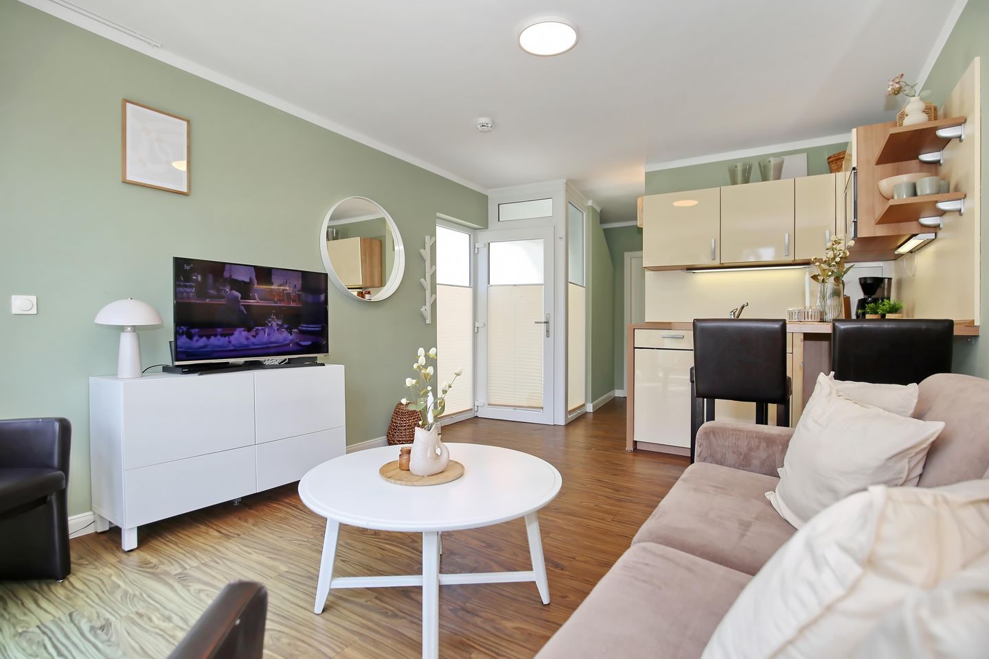 Der gemütliche Wohnbereich der Ferienwohnung lädt mit einer Couch, zwei Sesseln, einem Flatscreen-TV und einer Stereoanlage mit Dockingstation zu geselligen Abenden ein. Den WLAN-Anschluss der Wohnung kannst du kostenlos nutzen. Der integrierte Essbereich ist als Tresen das Verbindungsstück zwischen dem Wohnbereich und der Küche. Hier hast du ausreichend Platz für gemeinsame Mahlzeiten.