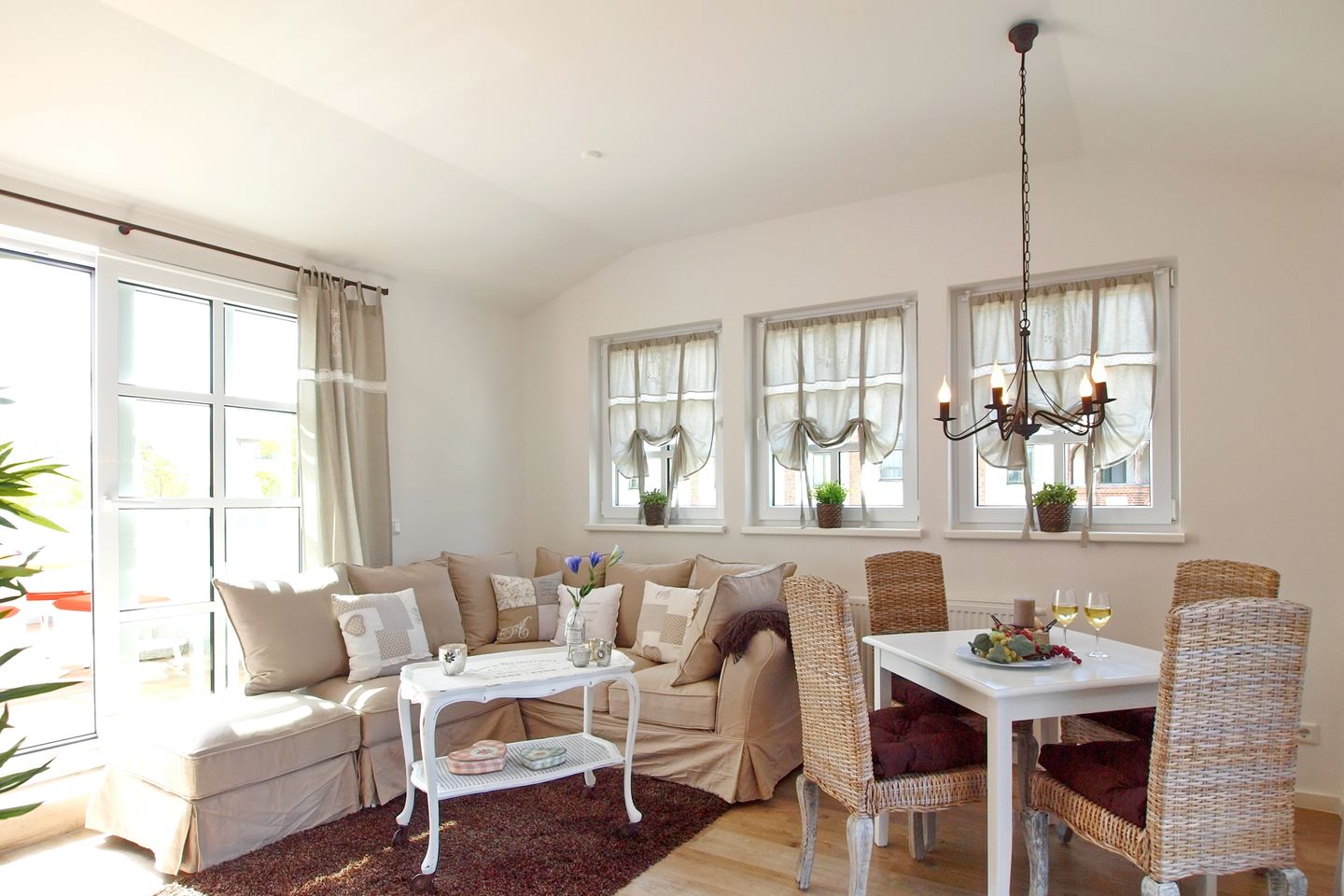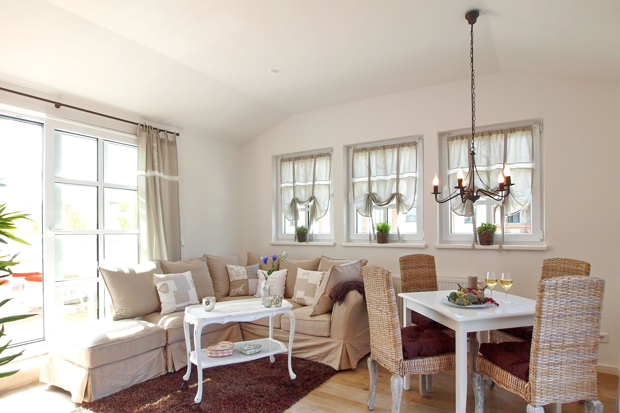 Die Wohnung befindet sich in der 3. Etage (Dachgeschoss) und verfügt über zwei Dachterrassen. Der Boden ist mit einem modernen Designbelag ausgelegt. Im offenen Wohnbereich finden Sie eine komfortable Eckcouch, einen Couchtisch sowie einen Flachbild-TV.