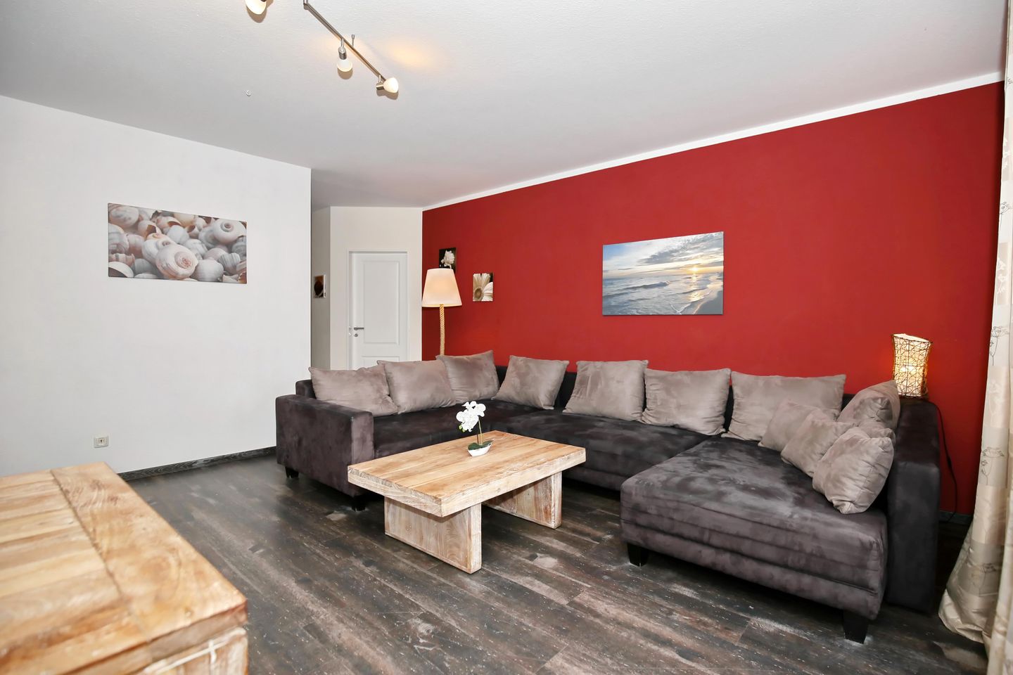 Verbringen Sie gemütliche Stunden im Wohnzimmer auf der großen Wohnlandschaft. Das Sofa lässt sich mit wenigen Handgriffen in einen Schlafplatz (1 x 130 x 200 cm) verwandeln. Für Abwechslung am Abend sorgen der Flachbild-TV, der DVD-Player, der CD-Player mit Radio, Bücher und Spiele sowie das kostenfreie WLAN. Genießen Sie gemeinsame Mahlzeiten am Esstisch mit 4 Stühlen.