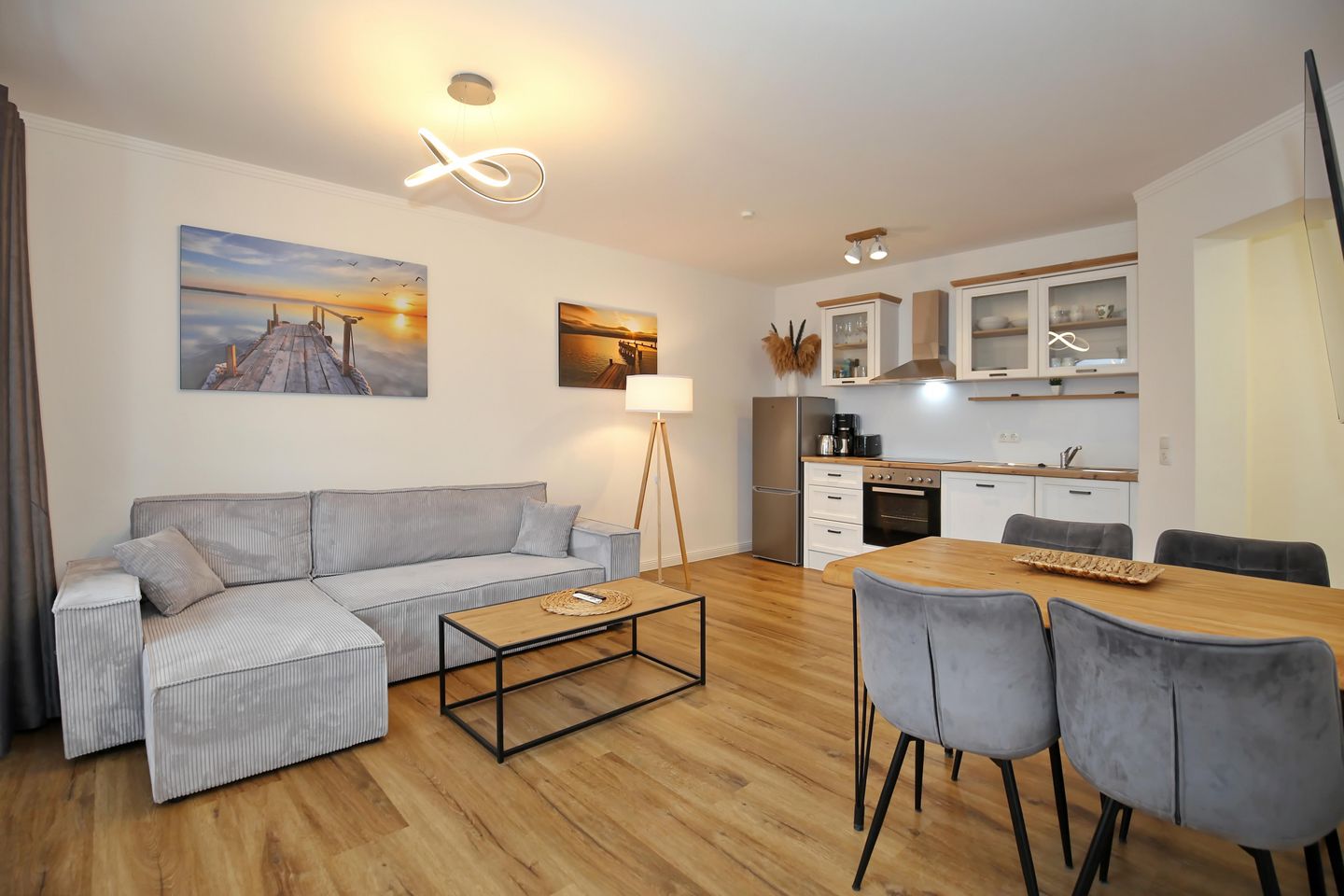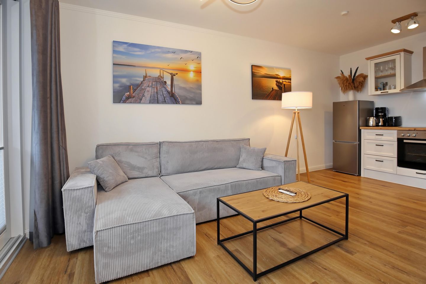 Die angrenzende offene Küchenzeile ist mit einem Kühlschrank mit Gefrierfach, einem Geschirrspüler, einem 4-Platten-Cerankochfeld und einem Backofen voll ausgestattet. Die Küchenausstattung wird durch einen Toaster, eine Kaffeemaschine und einen Wasserkocher ergänzt. Von hier aus haben Sie ebenfalls einen Blick auf die Ostsee.