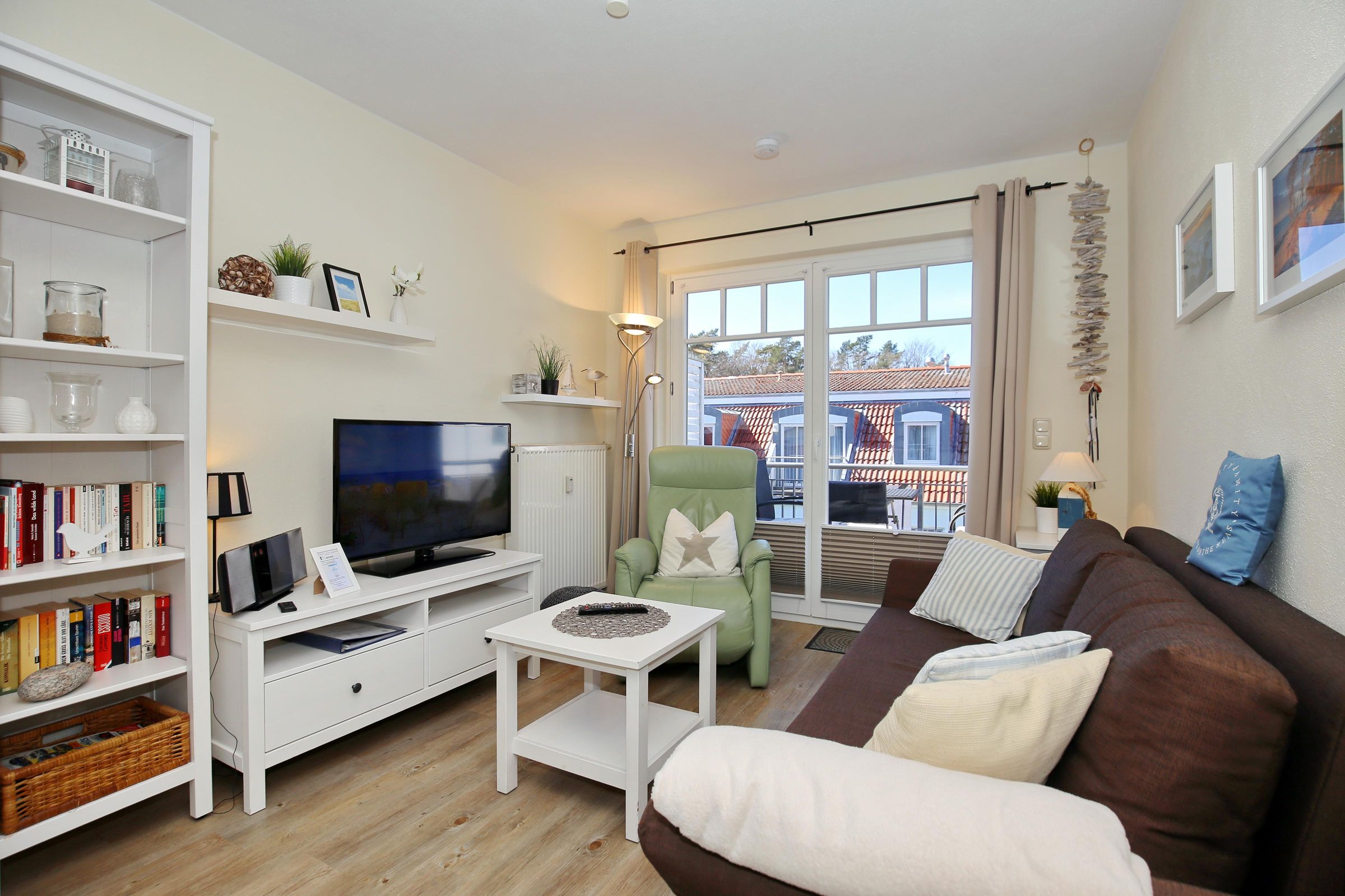 Im modernen Wohnzimmer befindet sich ein umbaufähiges Schlafsofa. Hier kann die dritte Person bequem schlafen. Ein LCD-TV mit DVD-Player, eine Radio/CD-Kombination mit USB/iPod/Bluetooth-Schnittstelle, ein kostenloser WLAN-Zugang und eine Auswahl an Büchern sorgen in der Ferienwohnung für Unterhaltung.