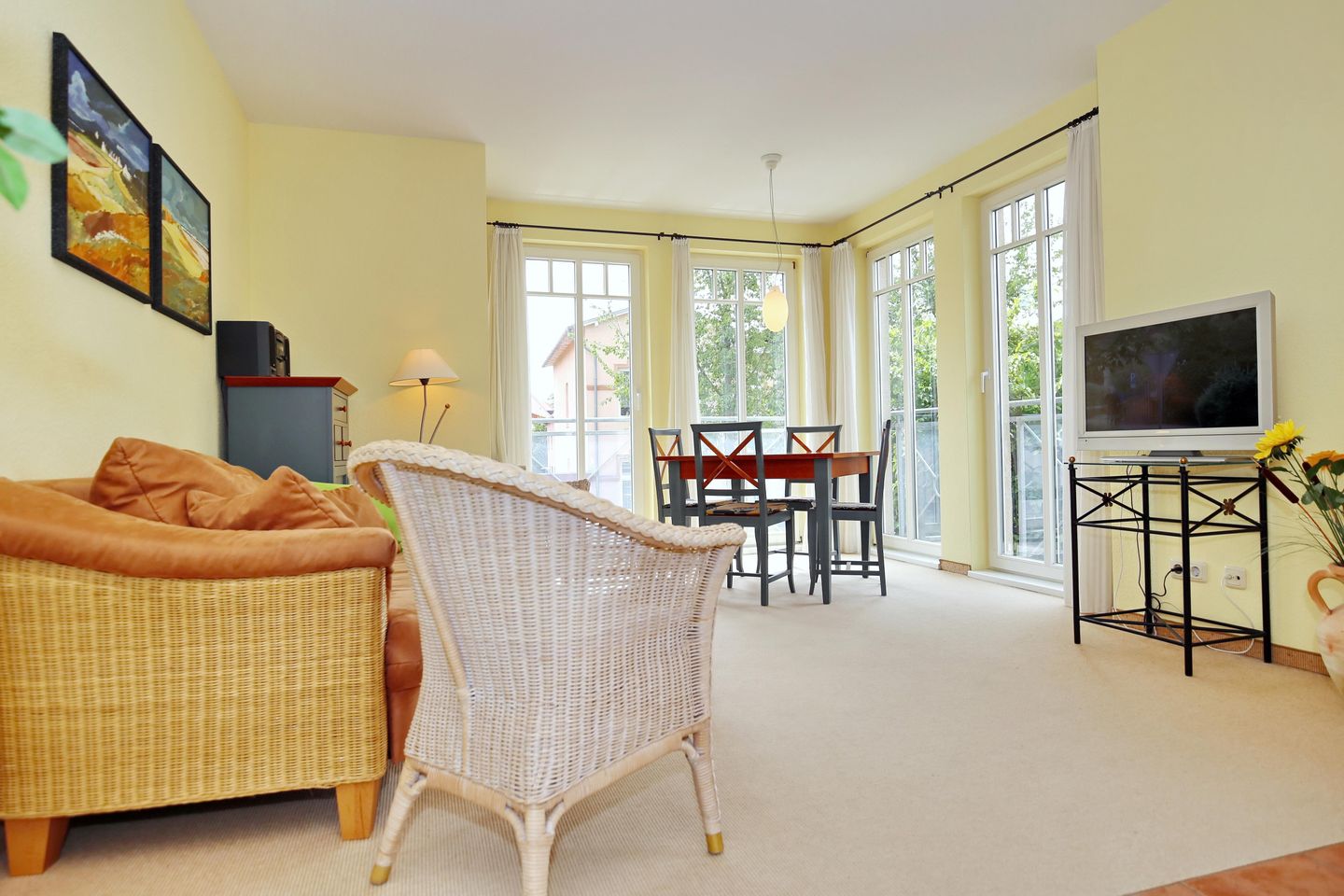 Der lichtdurchflutete Wohnbereich ist ausgestattet mit einer Couch und zwei Korbstühlen. Für Unterhaltung und Abwechslung sorgen am Abend der Flachbild-Fernseher oder die Stereoanlage. Der Balkon kann vom großen Schlafzimmer aus betreten werden. Auf dem kleinen Balkon zur Südseite kannst du die Sonnenstunden an der frischen Luft genießen.