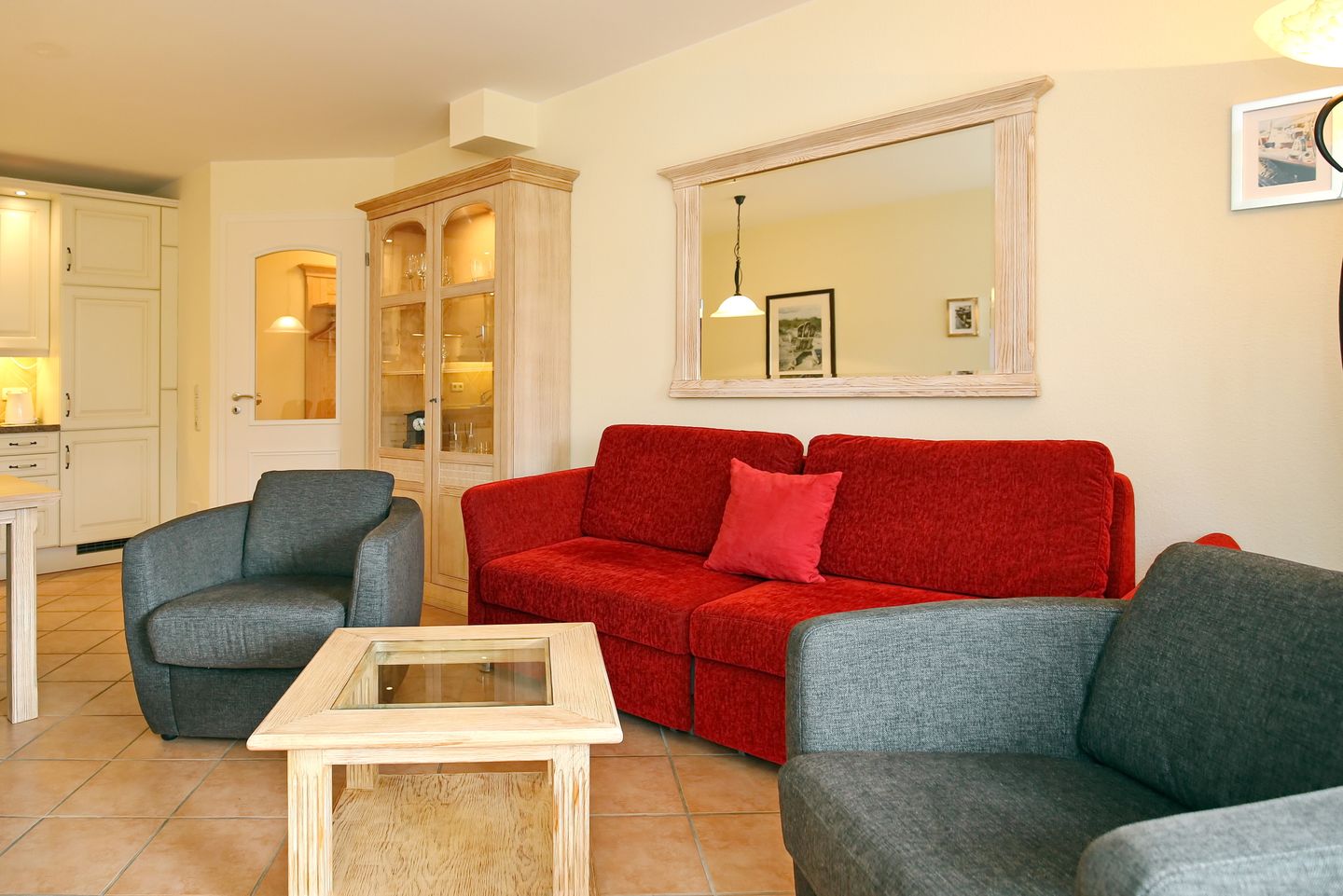 Im offenen Wohnbereich laden Sie eine Couch mit zwei Sesseln, ein Flachbild-TV, ein DVD-Player und eine Stereoanlage zu entspannten Abenden ein. Von hier aus gelangen Sie auf den südlich ausgerichteten Balkon und können die Sonnenstunden des Tages genießen. Der integrierte Essbereich ist für 2 Personen großzügig eingerichtet. Außerdem steht Ihnen kostenfreies WLAN zur Verfügung.