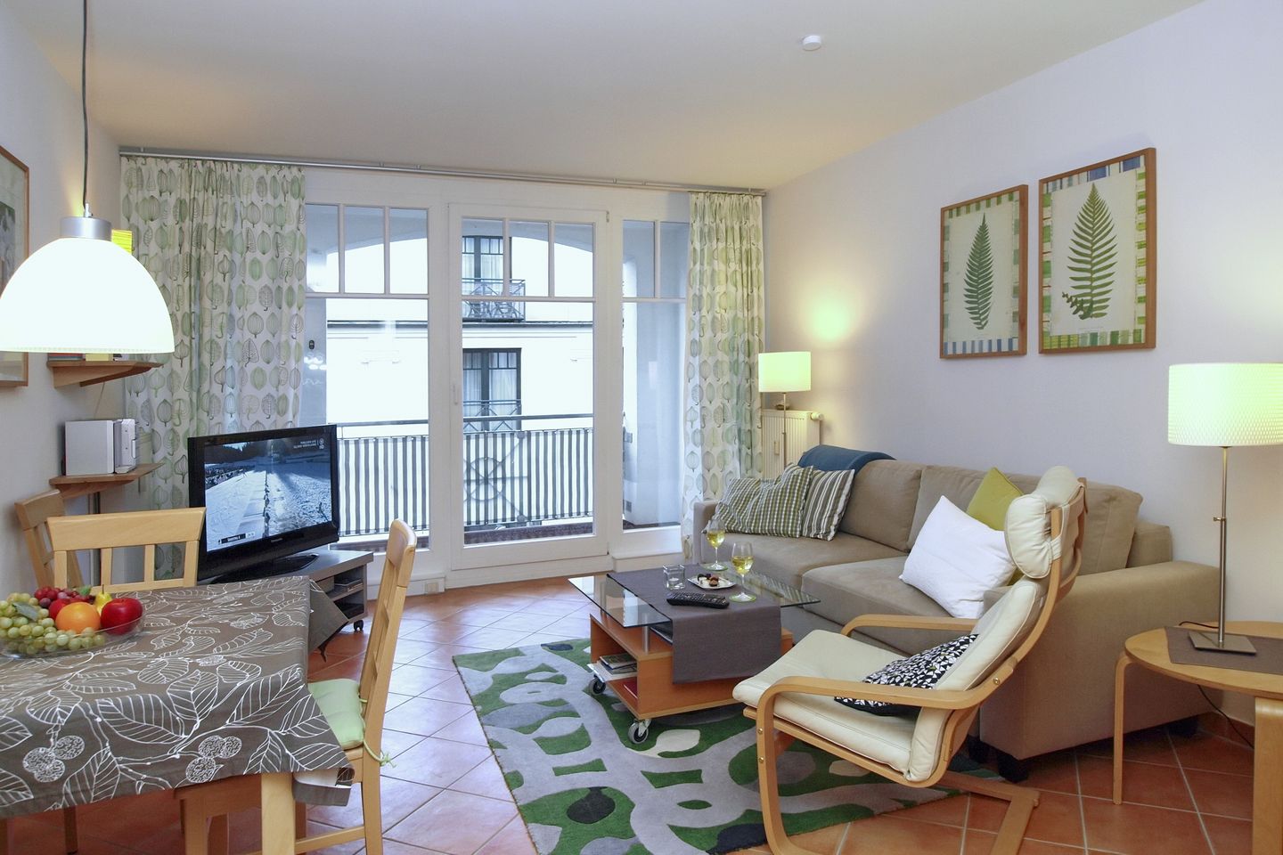 Im großzügigen Wohnraum der Ferienwohnung laden ein bequemes Schlafsofa (140 cm x 200 cm) und 1 Schwingsessel zu gemütlichen Fernsehabenden mit einem modernen Flachbild-TV und einem Blu-Ray-Player ein. Für Ihren Aufenthalt steht Ihnen kostenfreien WLAN (ohne Gewähr) zur Verfügung. Durch das Schlafsofa ist eine Aufbettung auf 3 Personen möglich. Der Essbereich bietet genügend Platz zum Verweilen. Ein Internetradio steht zur Verfügung.