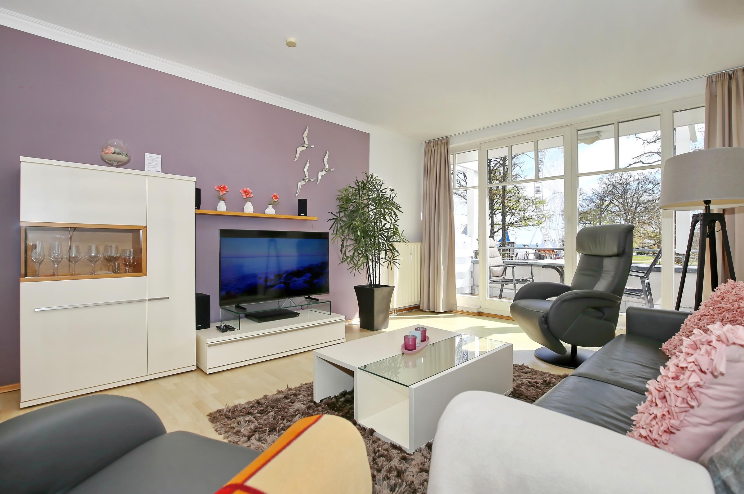 Im großzügigen Wohnraum der Ferienwohnung laden ein bequemes Doppelschlafsofa (140 x 200 cm) und zwei Sessel zu geselligen Fernsehabenden mit einem modernen Flachbild-TV und einem Blu-ray-Player ein. Durch das Doppelschlafsofa ist eine Belegung mit bis zu vier Personen möglich. Verschiedene Bücher sorgen für unterhaltsame oder auch entspannte Momente. Ebenso können Sie das kostenlose WLAN nutzen (ohne Gewähr).