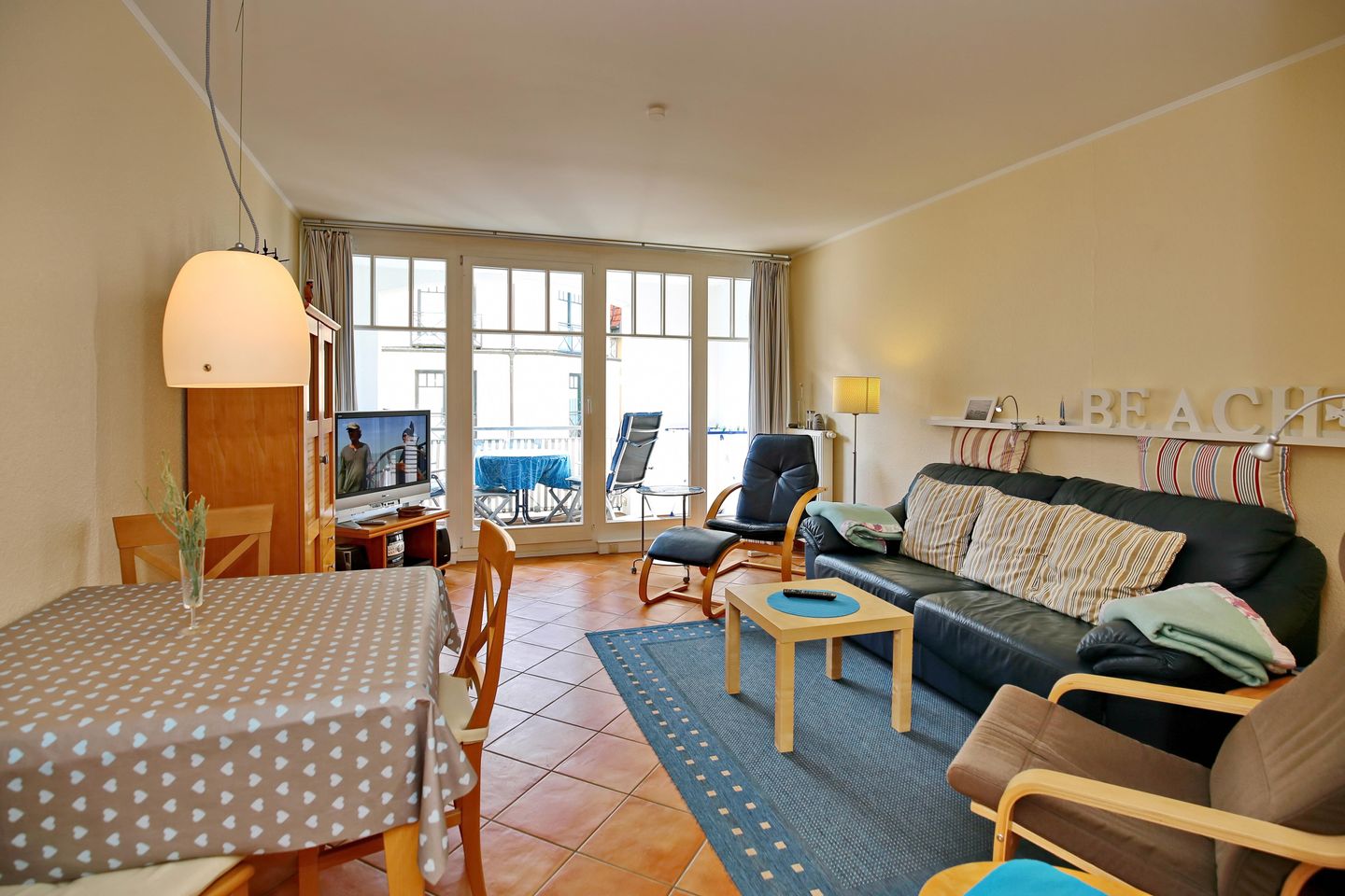 Im großzügigen Wohnraum laden ein bequemes Schlafsofa (140 x 200 cm) sowie zwei Schwingsessel mit Hockern zu geselligen Fernsehabenden mit einem modernen Flachbild-TV ein. Durch das Schlafsofa ist eine Aufbettung für bis zu drei Personen möglich. Der angrenzende Essbereich bietet ausreichend Platz zum Verweilen.