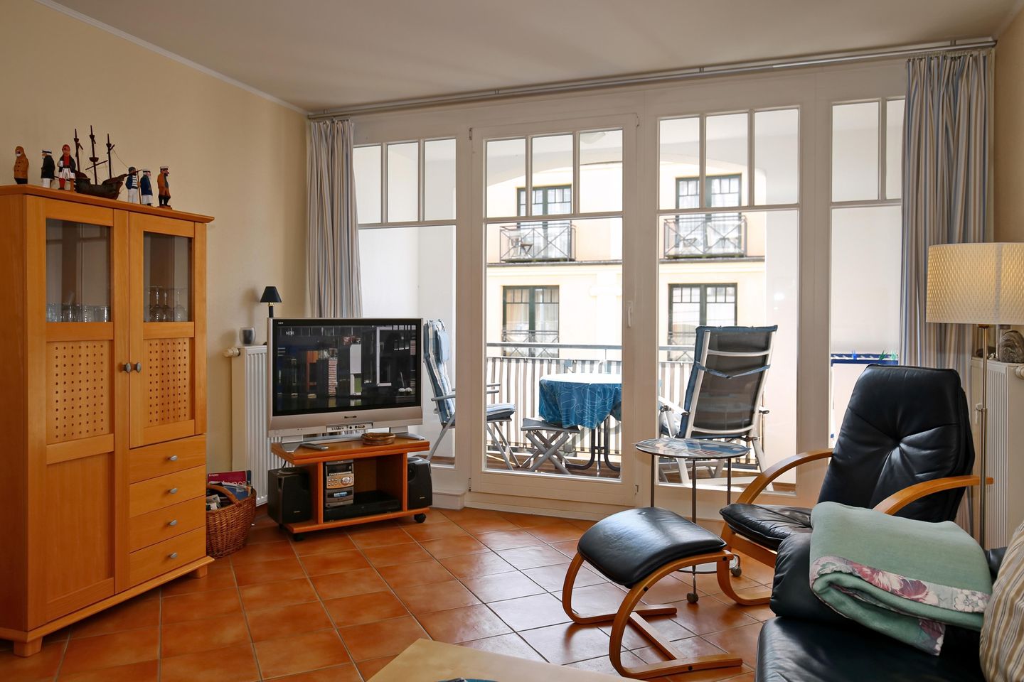 Im Schlafzimmer erwartet Sie ein Doppelbett (2 x 90 x 200 cm) für erholsamen Schlaf. Ein großer Spiegelkleiderschrank bietet viel Stauraum für Ihre persönlichen Gegenstände. Plissee und Vorhänge sorgen für eine angenehme Verdunkelung (das Schlafzimmerfenster ist zum Atrium ausgerichtet).