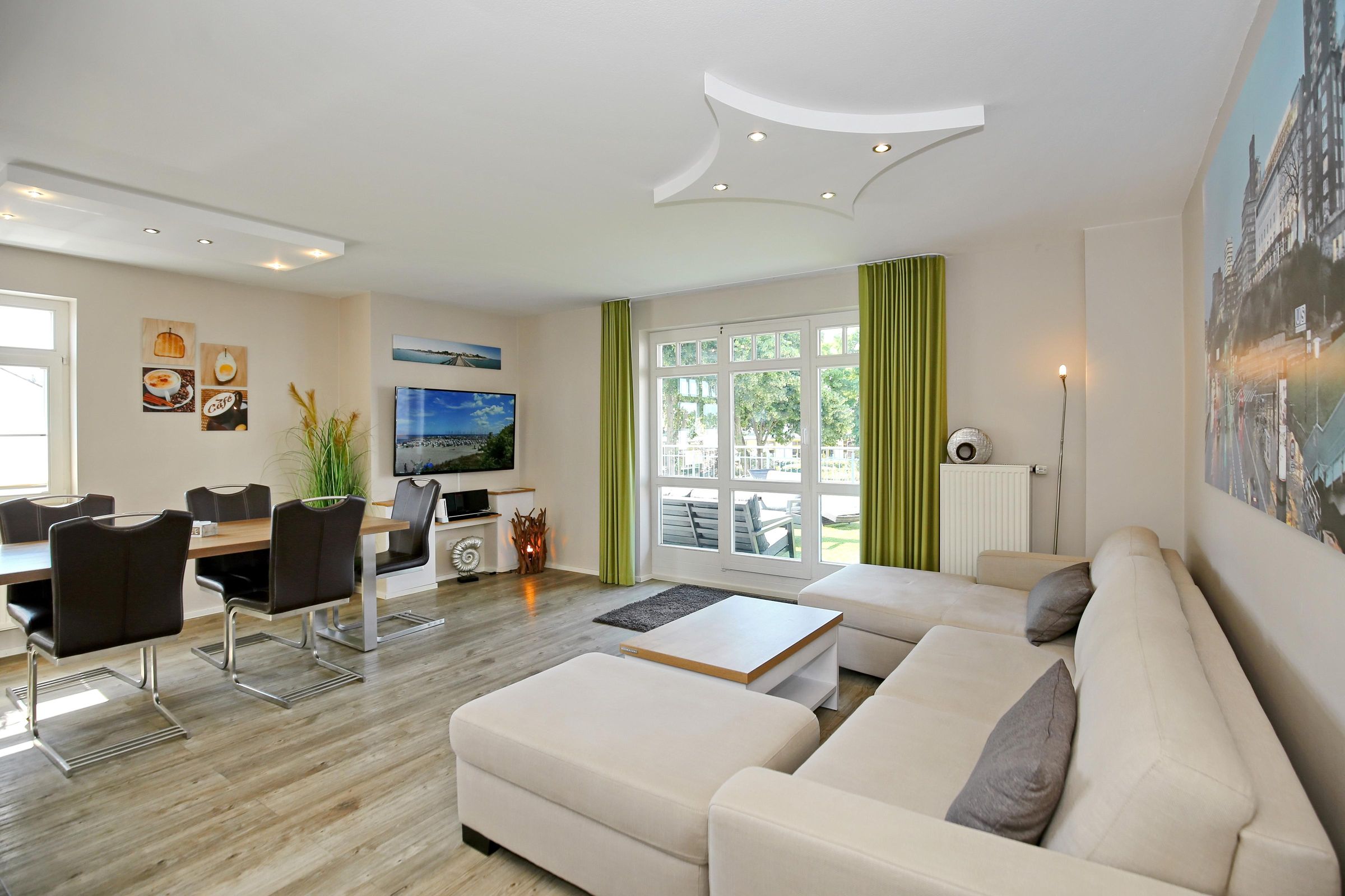 Der sehr großzügige und modern eingerichtete Wohnbereich lädt mit einer gemütlichen Wohnlandschaft mit Schlaffunktion (160 cm x 200 cm), einem modernen Flachbild-TV, einem DVD-Player sowie einer Spielekonsole (Wii-Konsole) zum Verweilen ein. Von hier aus gelangen Sie auf die großzügige Südterrasse. Am Esstisch finden Sie ausreichend Platz für gemeinsame Mahlzeiten.