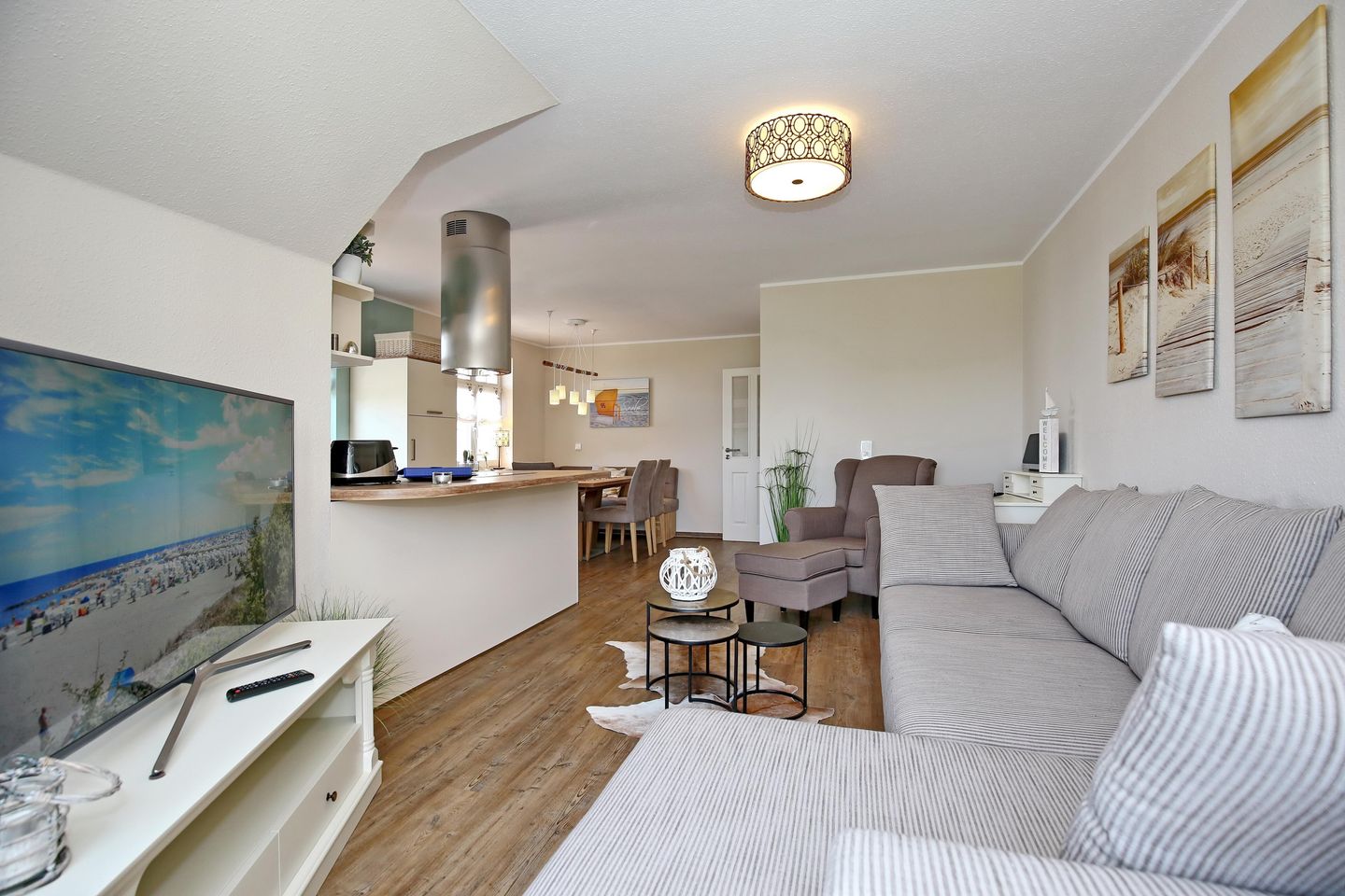 Der offene Wohn- und Essbereich der Ferienwohnung verfügt über ein großes Lounge-Sofa sowie einen separaten Sessel, einen Flachbild-TV und eine Musikanlage mit Bluetooth. Zusätzlich steht Ihnen kostenloses WLAN zur Verfügung. Die gemütliche Essecke lädt zum Verweilen bei gemeinsamen Mahlzeiten oder netten Spieleabenden ein.