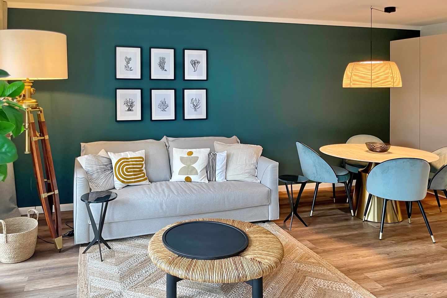 Der stilvolle Wohnbereich der Ferienwohnung lädt Sie mit einer gemütlichen Schlafcouch (160 x 200 cm) und einem 65 Zoll Samsung 4K Flachbild-TV zu geselligen Abendstunden ein. Der Essbereich ist im Wohnbereich integriert und bietet Ihnen Platz für gemeinsame Mahlzeiten.