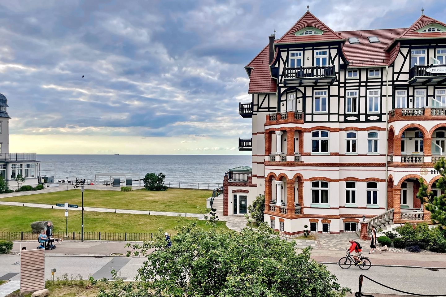 Genießen Sie die frische Ostseeluft und einen herrlichen Seeblick vom Balkon mit Nord-Ost-Ausrichtung und den modernen Loungemöbeln.