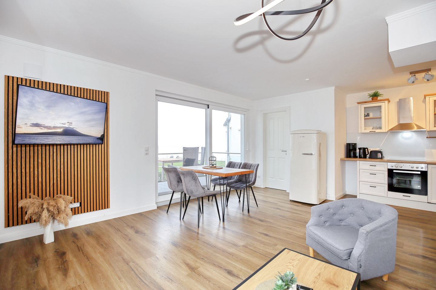 Die angrenzende offene Küchenzeile ist mit einem Kühlschrank mit Gefrierfach, einem Geschirrspüler, einem 4-Platten-Cerankochfeld und einem Backofen voll ausgestattet. Die Küchenausstattung wird durch einen Toaster, eine Kaffeemaschine und einen Wasserkocher ergänzt. Von hier aus haben Sie ebenfalls einen Blick auf die Ostsee.